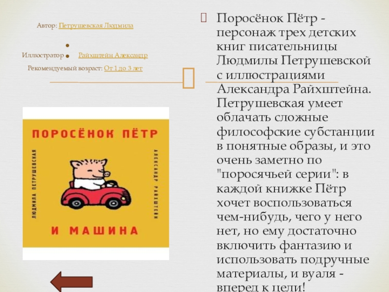 писательницы Людмилы Петрушевской с иллюстрациями Александра Райхштейна. Петрушевская умеет облачать сложные философские субстанции в понятные образы, и это очень заметно по "поросячьей серии": в каждой книжке Пётр хочет воспользоваться чем-нибудь, чего у него нет, но ему достаточно включить фантазию и использовать подручные материалы, и вуаля - вперед к цели!