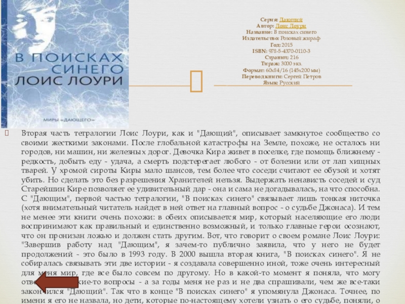 тетралогии Лоис Лоури, как и "Дающий", описывает замкнутое сообщество со своими жесткими законами. После глобальной катастрофы на Земле, похоже, не осталось ни городов, ни машин, ни железных дорог. Девочка Кира живет в поселке, где помощь ближнему - редкость, добыть еду - удача, а смерть подстерегает любого - от болезни или от лап хищных тварей. У хромой сироты Киры мало шансов, тем более что соседи считают ее обузой и хотят убить. Но сделать это без разрешения Хранителей нельзя. Выдержать ненависть соседей и суд Старейшин Кире позволяет ее удивительный дар - она и сама не догадывалась, на что способна. С "Дающим", первой частью тетралогии, "В поисках синего" связывает лишь тонкая ниточка (хотя внимательный читатель найдет в ней ответ на главный вопрос - о судьбе Джонаса). И тем не менее эти книги очень похожи: в обеих описывается мир, который населяющие его люди воспринимают как правильный и единственно возможный, и только главные герои осознают, что он пронизан ложью и должен стать другим. Вот, что говорит о своем романе Лоис Лоури: "Завершив работу над "Дающим", я зачем-то публично заявила, что у него не будет продолжений - это было в 1993 году. В 2000 вышла вторая книга, "В поисках синего". Я не собиралась связывать эти две истории - я создавала совершенно иной, тоже очень интересный для меня мир, где все было совсем по другому. Но в какой-то момент я поняла, что могу ответить на какие-то вопросы - а за годы меня не раз и не два спрашивали, чем же все-таки закончился "Дающий". Так что в конце "В поисках синего" я упомянула Джонаса. Точнее, по имени я его не назвала, но дети, которые по-настоящему хотели узнать о его судьбе, поняли, о ком речь". (Интервью The Wire, 2012