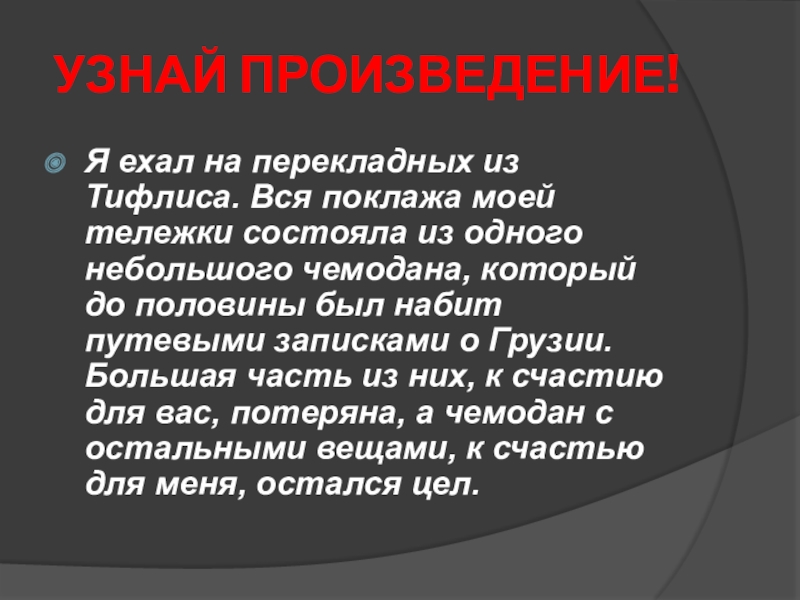 тележки состояла из одного небольшого чемодана, который до половины был набит путевыми записками о Грузии. Большая часть из них, к счастию для вас, потеряна, а чемодан с остальными вещами, к счастью для меня, остался цел.