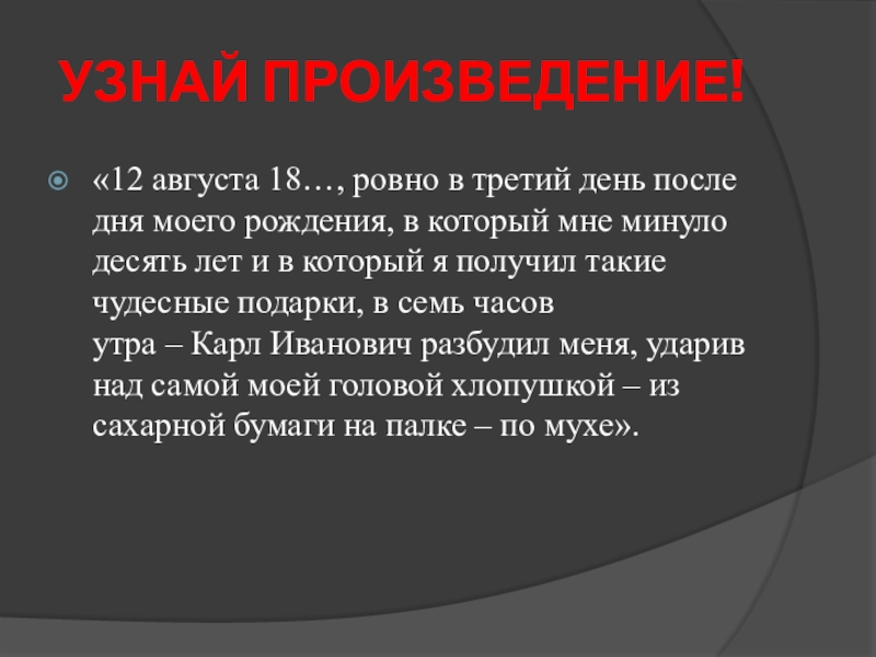 утра – Карл Иванович разбудил меня, ударив над самой моей головой хлопушкой – из сахарной бумаги на палке – по мухе».