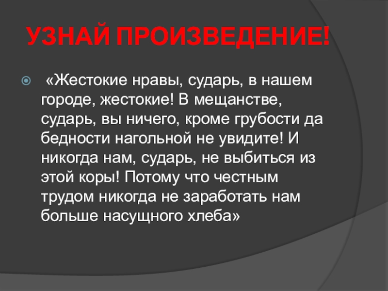 мещанстве, сударь, вы ничего, кроме грубости да бедности нагольной не увидите! И никогда нам, сударь, не выбиться из этой коры! Потому что честным трудом никогда не заработать нам больше насущного хлеба»