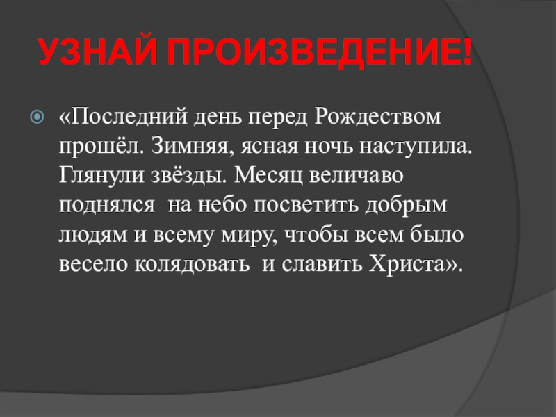 «Последний день перед Рождеством прошёл. Зимняя, ясная ночь наступила.