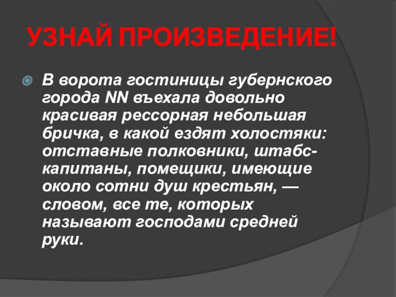 В ворота гостиницы губернского города NN въехала довольно красивая