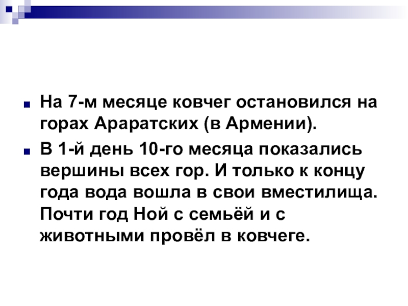 Слайд 19На 7-м месяце ковчег остановился на горах Араратских (в Армении).