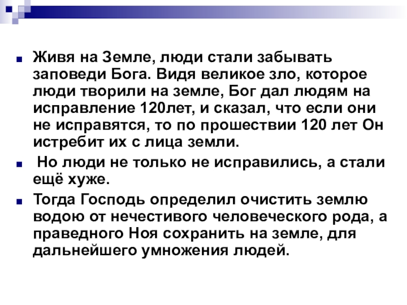 Слайд 7Живя на Земле, люди стали забывать заповеди Бога. Видя великое зло,