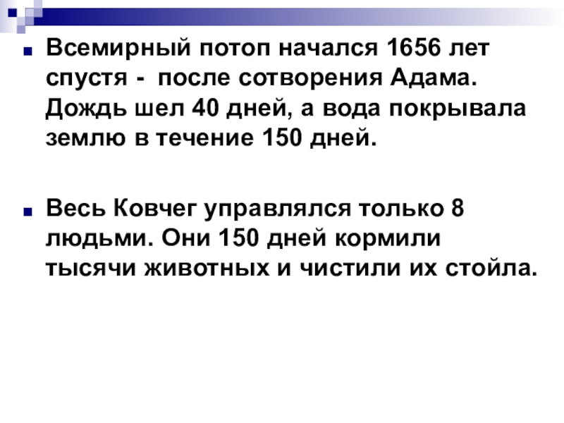 Слайд 14Всемирный потоп начался 1656 лет спустя - после сотворения Адама. Дождь