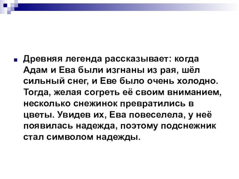 шёл сильный снег, и Еве было очень холодно. Тогда, желая согреть её своим вниманием, несколько снежинок превратились в цветы. Увидев их, Ева повеселела, у неё появилась надежда, поэтому подснежник стал символом надежды.