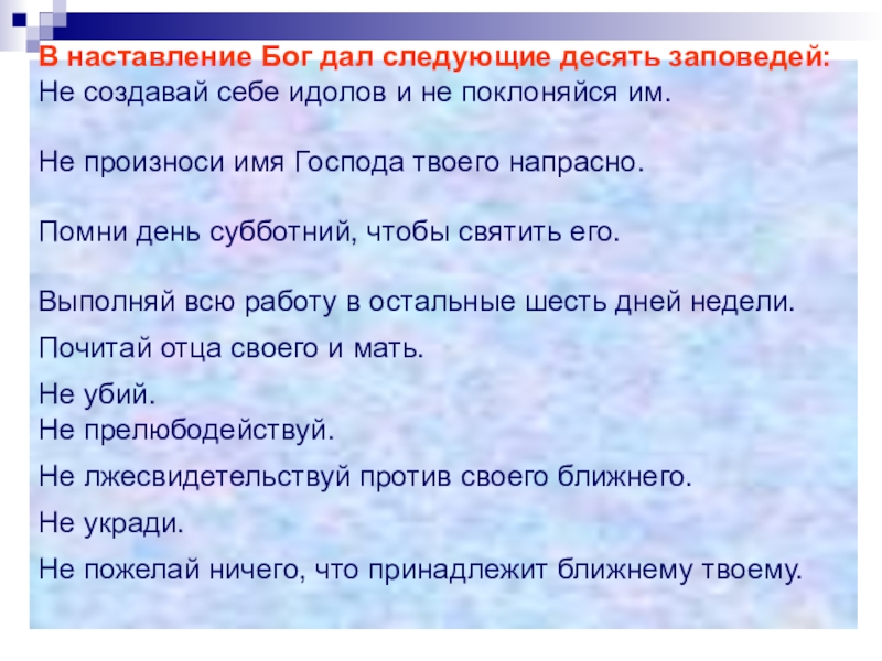 Слайд 6В наставление Бог дал следующие десять заповедей: