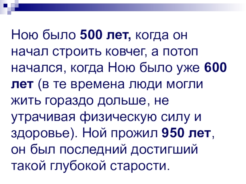Слайд 13Ною было 500 лет, когда он начал строить ковчег, а потоп