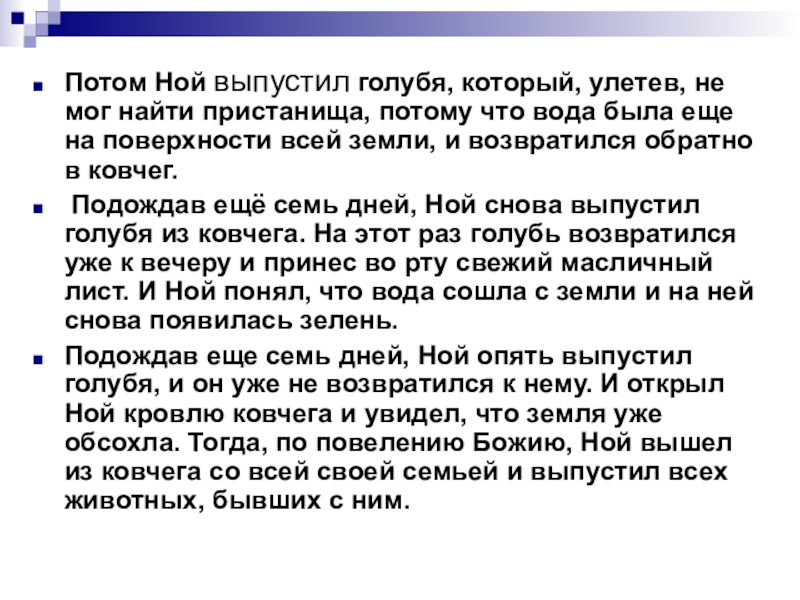 Слайд 21Потом Ной выпустил голубя, который, улетев, не мог найти пристанища, потому