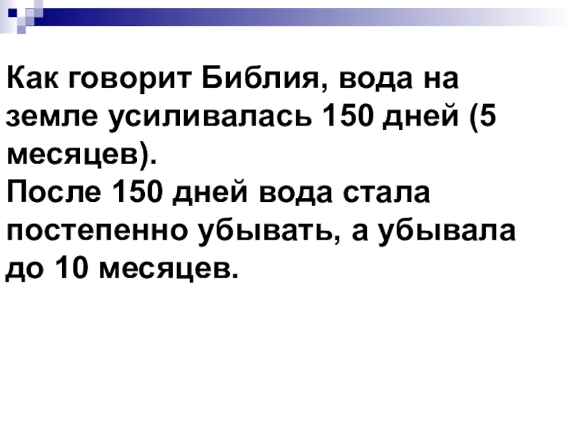 Слайд 18Как говорит Библия, вода на земле усиливалась 150 дней (5 месяцев).