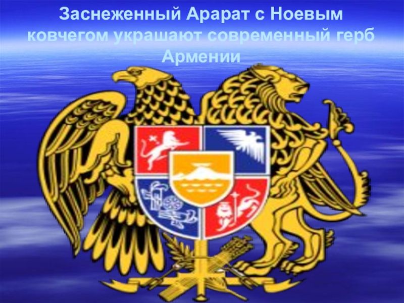 Слайд 23Заснеженный Арарат с Ноевым ковчегом украшают современный герб Армении