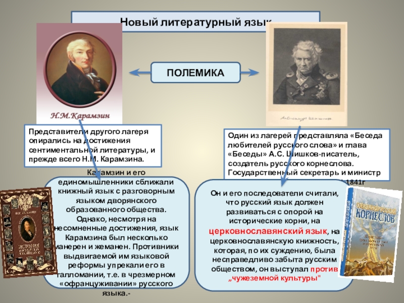 Карамзин и его единомышленники сближали книжный язык с разговорным языком дворянского образованного общества. Однако, несмотря на несомненные достижения, язык Карамзина был несколько манерен и жеманен. Противники выдвигаемой им языковой реформы упрекали его в галломании, т.е. в чрезмерном «офранцуживании» русского языка.-