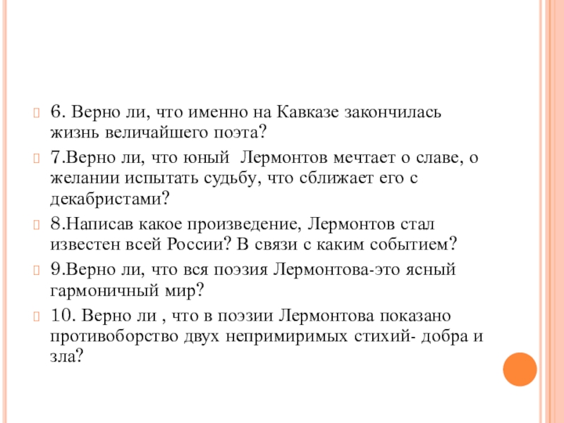 6. Верно ли, что именно на Кавказе закончилась жизнь величайшего поэта?7.Верно ли, что юный Лермонтов мечтает о