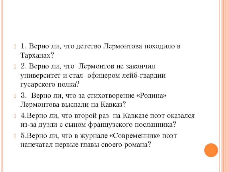 1. Верно ли, что детство Лермонтова походило в Тарханах?2. Верно ли, что Лермонтов не закончил университет и стал офицером лейб-гвардии гусарского полка?3. Верно ли, что за стихотворение «Родина» Лермонтова выслали на Кавказ?4.Верно ли, что второй раз