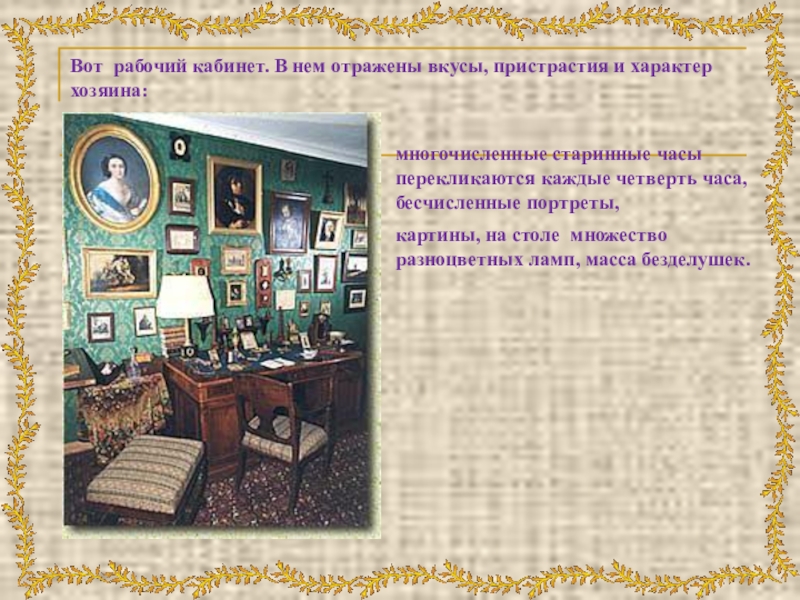 многочисленные старинные часы перекликаются каждые четверть часа, бесчисленные портреты,