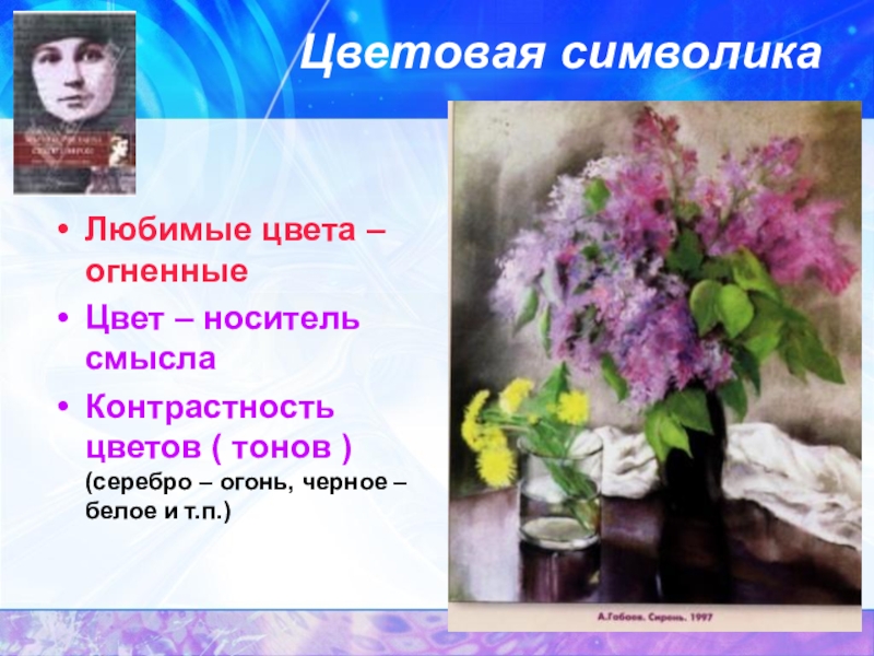 Цветовая символика Любимые цвета – огненныеЦвет – носитель смыслаКонтрастность цветов ( тонов ) (серебро – огонь, черное