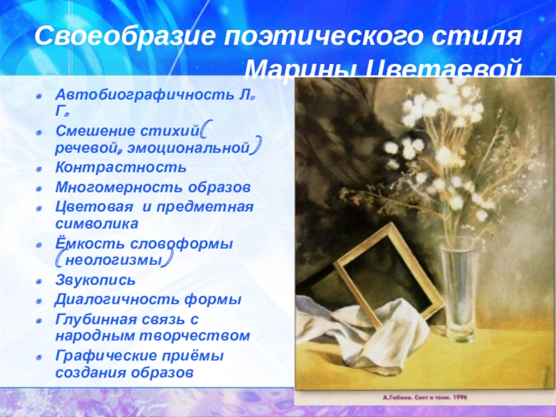 Своеобразие поэтического стиля Марины Цветаевой Автобиографичность Л. Г.Смешение стихий( речевой, эмоциональной)Контрастность Многомерность образовЦветовая и предметная символикаЁмкость словоформы