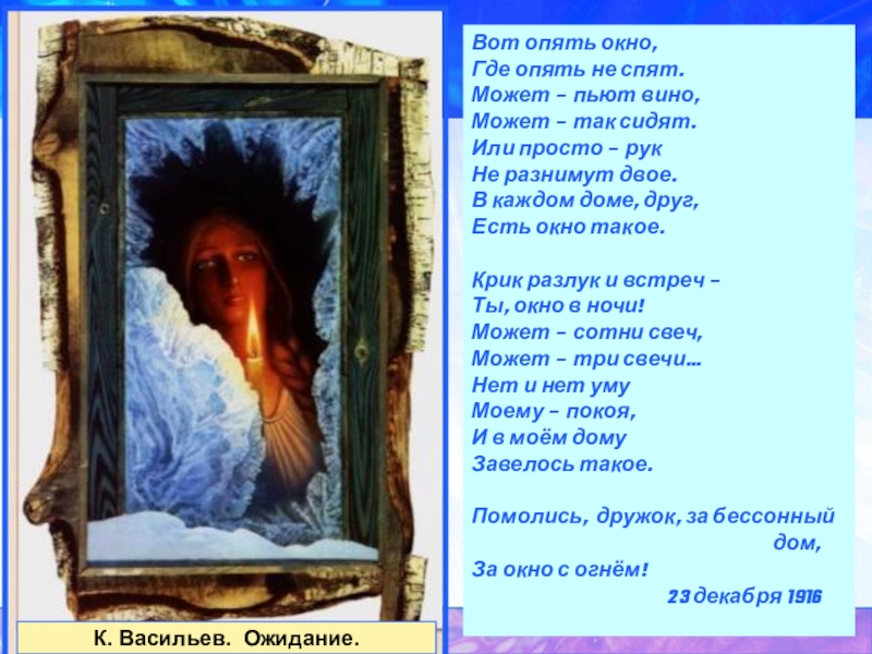 Вот опять окно,Где опять не спят.Может – пьют вино, Может – так сидят.Или просто – рукНе разнимут