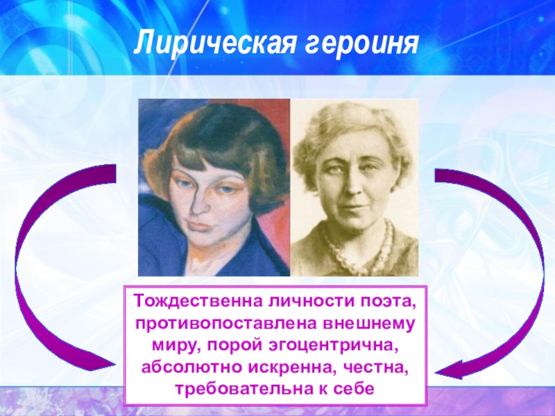 Лирическая героиняТождественна личности поэта, противопоставлена внешнему миру, порой эгоцентрична, абсолютно искренна, честна, требовательна к себе