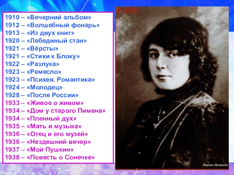 1910 – «Вечерний альбом»1912 – «Волшебный фонарь»1913 – «Из двух книг»1920 – «Лебединый стан»1921 – «Вёрсты»1921 –