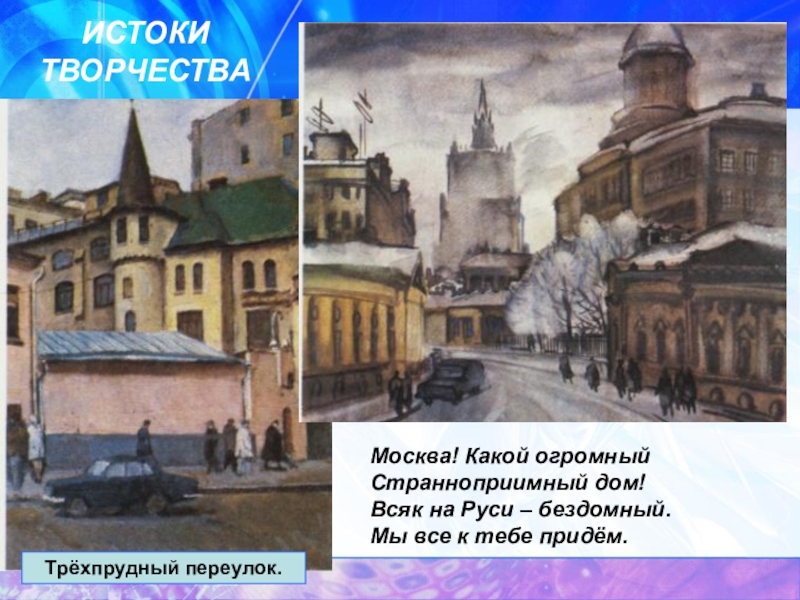 ИСТОКИ ТВОРЧЕСТВА  Трёхпрудный переулок.Москва! Какой огромныйСтранноприимный дом!Всяк на Руси – бездомный.Мы все к тебе придём.