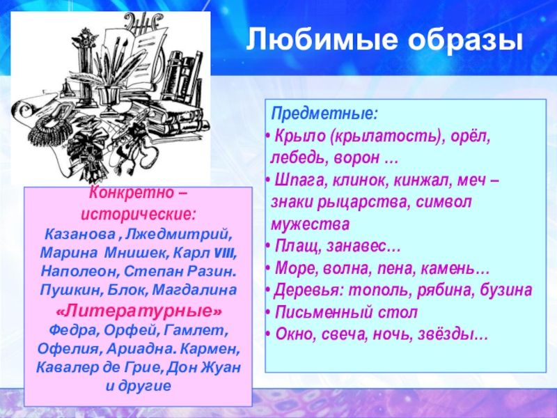 Любимые образы Предметные: Крыло (крылатость), орёл, лебедь, ворон … Шпага, клинок, кинжал, меч – знаки рыцарства, символ