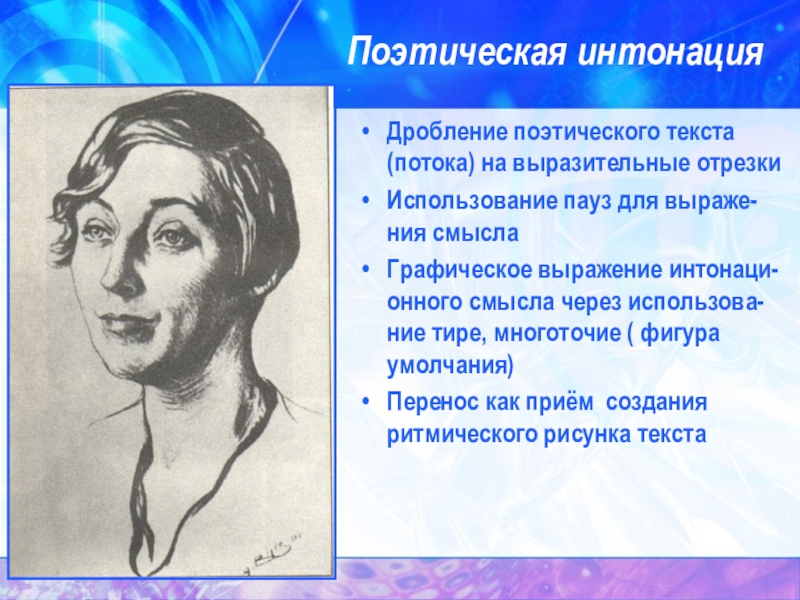 Поэтическая интонация Дробление поэтического текста (потока) на выразительные отрезкиИспользование пауз для выраже- ния смыслаГрафическое выражение интонаци-онного смысла