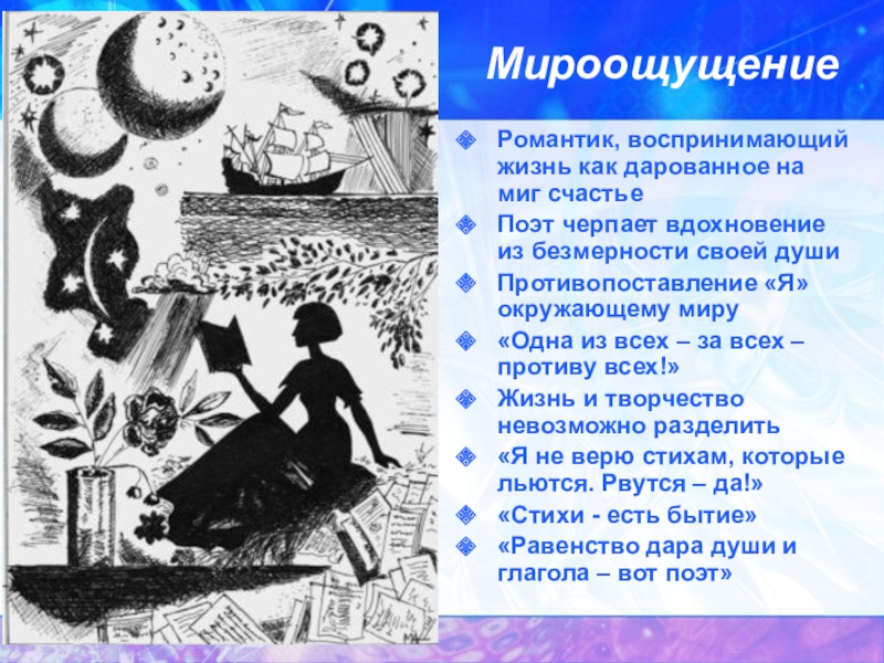Мироощущение Романтик, воспринимающий жизнь как дарованное на миг счастьеПоэт черпает вдохновение из безмерности своей душиПротивопоставление «Я» окружающему