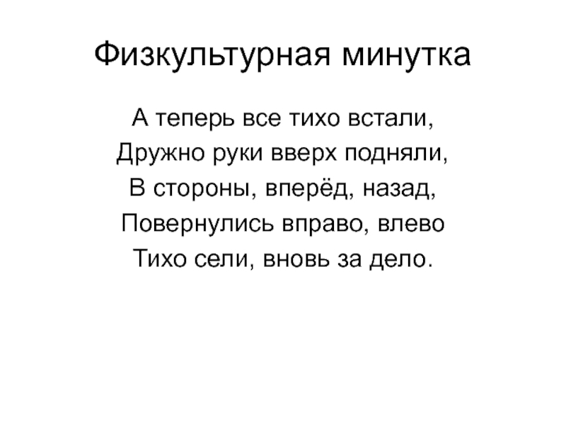 Физкультурная минутка А теперь все тихо встали,Дружно руки вверх подняли,В стороны, вперёд, назад,Повернулись вправо, влевоТихо сели, вновь