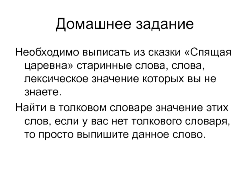 Домашнее заданиеНеобходимо выписать из сказки «Спящая царевна» старинные слова, слова, лексическое значение которых вы не знаете. Найти