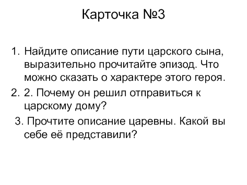 Карточка №3 Найдите описание пути царского сына, выразительно прочитайте эпизод. Что можно сказать о характере этого героя.2.