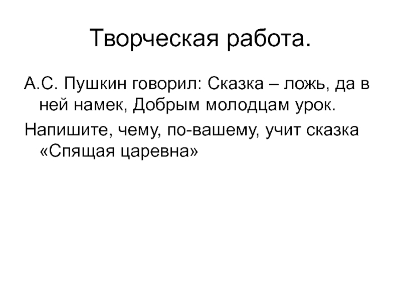 Творческая работа. А.С. Пушкин говорил: Сказка – ложь, да в ней намек, Добрым молодцам урок.Напишите, чему, по-вашему,