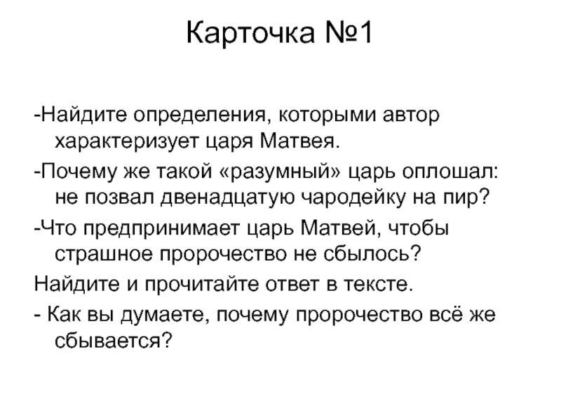 Карточка №1 -Найдите определения, которыми автор характеризует царя Матвея.-Почему же такой «разумный» царь оплошал: не позвал двенадцатую