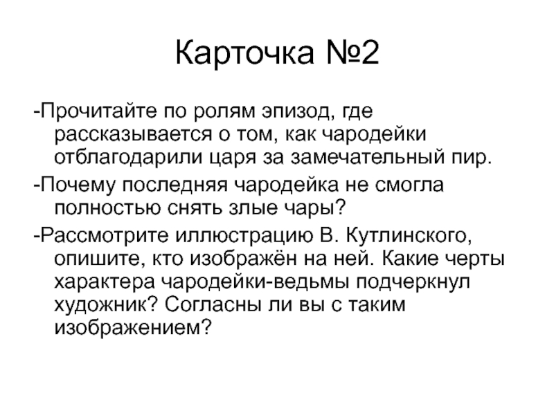 Карточка №2-Прочитайте по ролям эпизод, где рассказывается о том, как чародейки отблагодарили царя за замечательный пир.-Почему последняя
