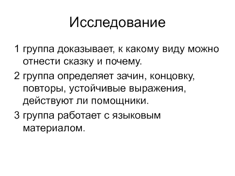 Исследование1 группа доказывает, к какому виду можно отнести сказку и почему.2 группа определяет зачин, концовку, повторы, устойчивые