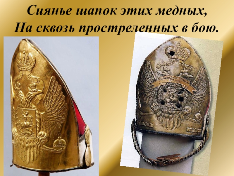 Слайд 53Сиянье шапок этих медных, На сквозь простреленных в бою.