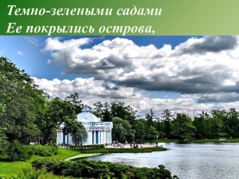 Слайд 27Темно-зелеными садами Ее покрылись острова,