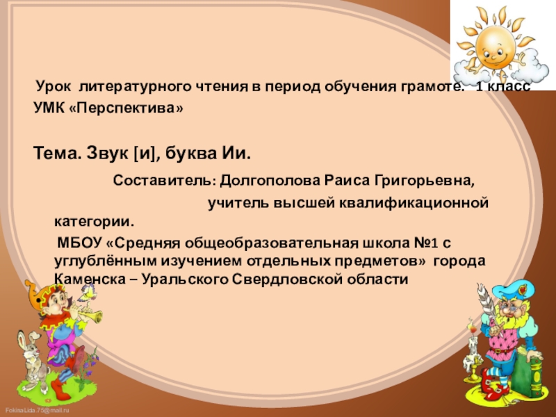 Урок литературного чтения в период обучения грамоте.  1 классУМК «Перспектива» Тема. Звук [и], буква Ии.