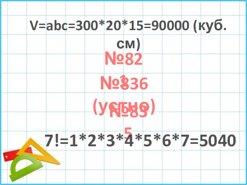 V=abc=300*20*15=90000 (куб.см)№821№836 (устно)№8357!=1*2*3*4*5*6*7=5040