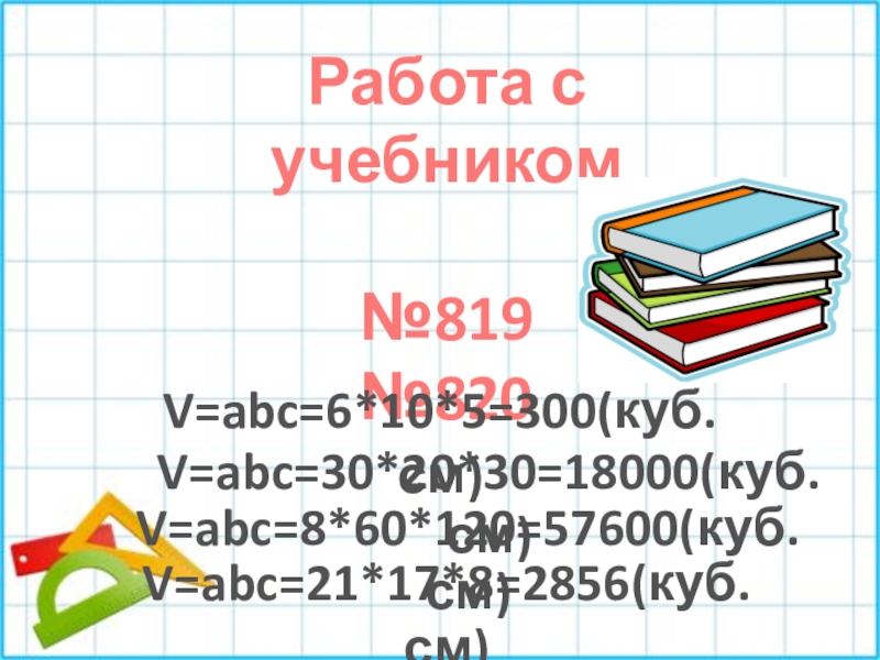 Работа с учебником№819№820V=abc=6*10*5=300(куб.см)V=abc=30*20*30=18000(куб.см)V=abc=8*60*120=57600(куб.см)V=abc=21*17*8=2856(куб.см)