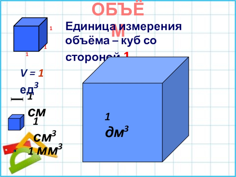 ОБЪЁМЕдиница измерения объёма – куб со стороной 11 см31 мм3 V = 1 ед3