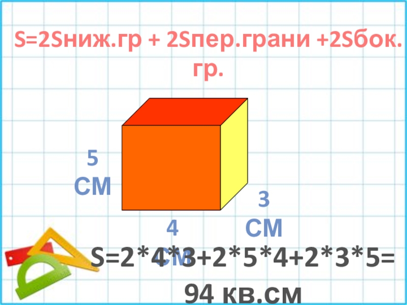 S=2Sниж.гр + 2Sпер.грани +2Sбок.гр.4 см5 см3 смS=2*4*3+2*5*4+2*3*5=94 кв.см