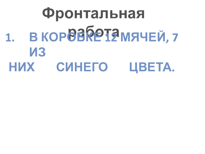 Фронтальная работаВ коробке 12 мячей, 7 изНих синего цвета. КакаяЧасть мячей синего цвета?