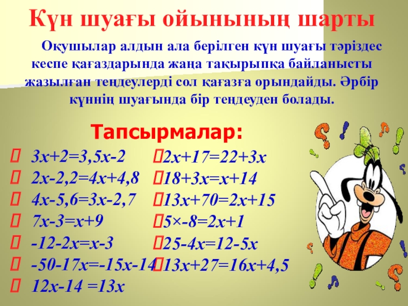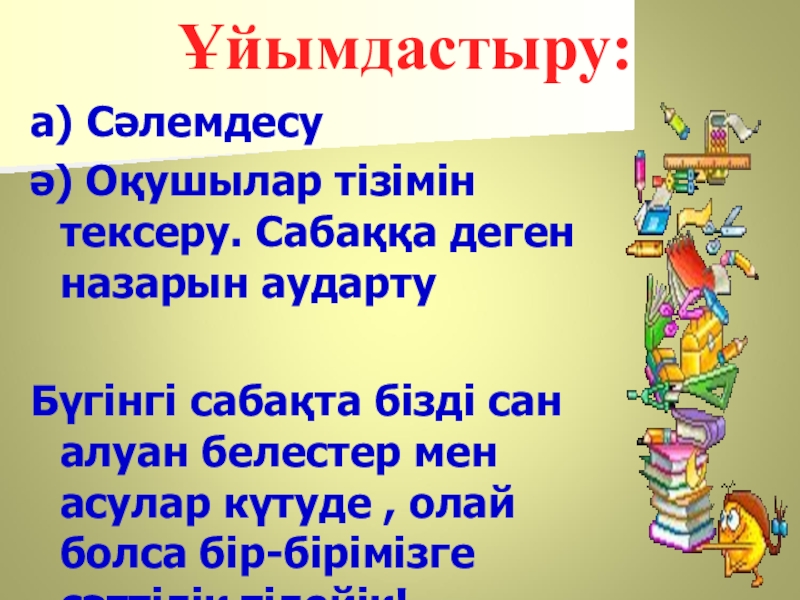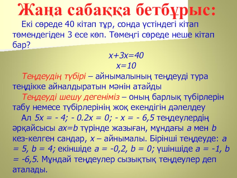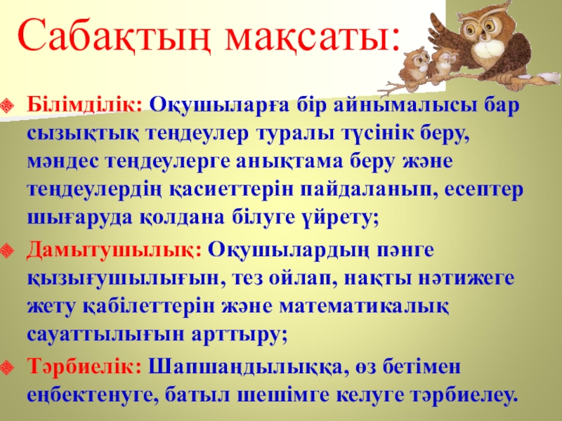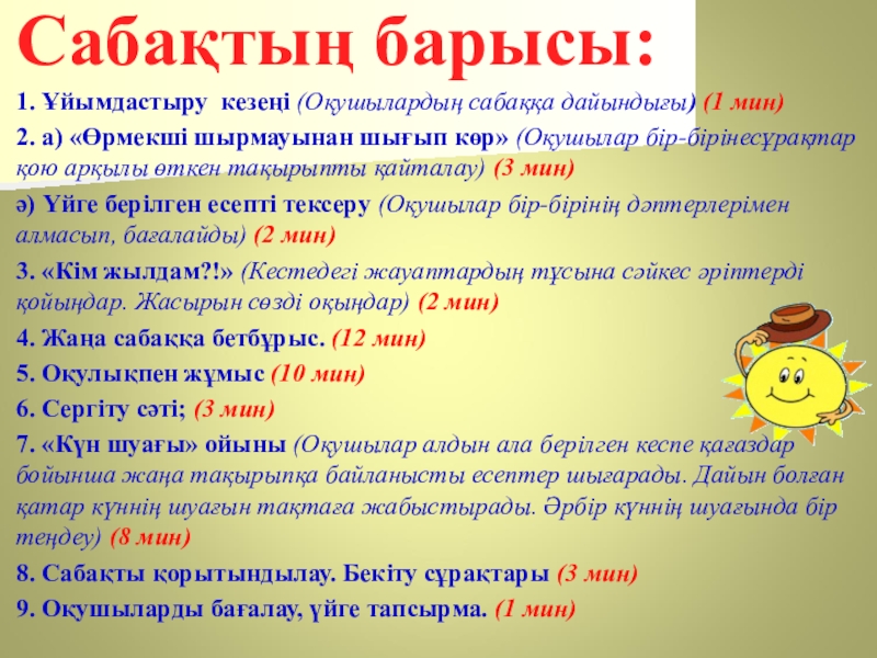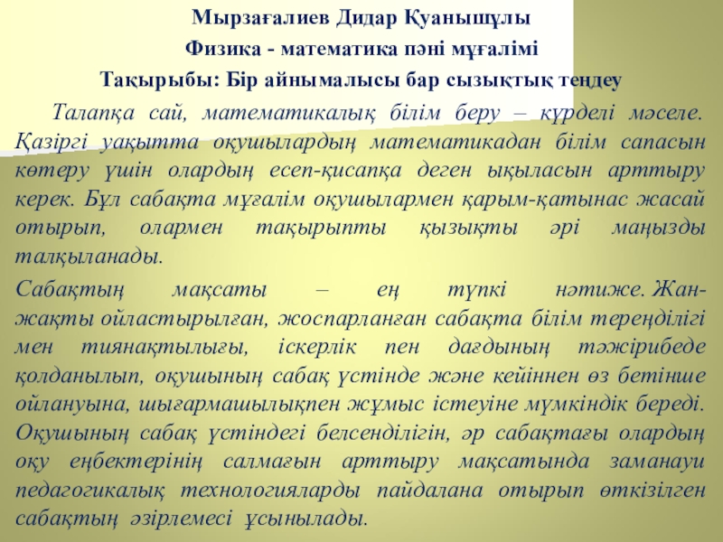 Талапқа сай, математикалық білім беру – күрделі мәселе. Қазіргі уақытта оқушылардың математикадан білім сапасын көтеру үшін олардың есеп-қисапқа деген ықыласын арттыру керек. Бұл сабақта мұғалім оқушылармен қарым-қатынас жасай отырып, олармен тақырыпты қызықты әрі маңызды талқыланады.