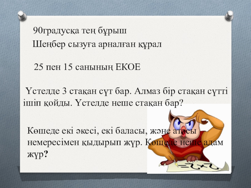 Көшеде екі әкесі, екі баласы, және атасы немересімен қыдырып жүр. Көшеде неше адам жүр?