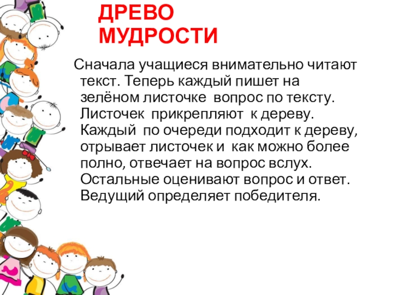 зелёном листочке вопрос по тексту. Листочек прикрепляют к дереву. Каждый по очереди подходит к дереву, отрывает листочек и как можно более полно, отвечает на вопрос вслух. Остальные оценивают вопрос и ответ. Ведущий определяет победителя.
