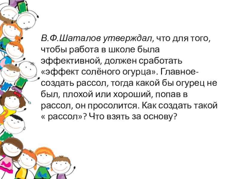 должен сработать «эффект солёного огурца». Главное- создать рассол, тогда какой бы огурец не был, плохой или хороший, попав в рассол, он просолится. Как создать такой « рассол»? Что взять за основу?