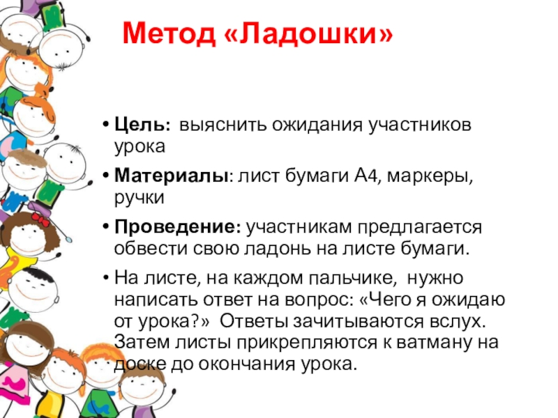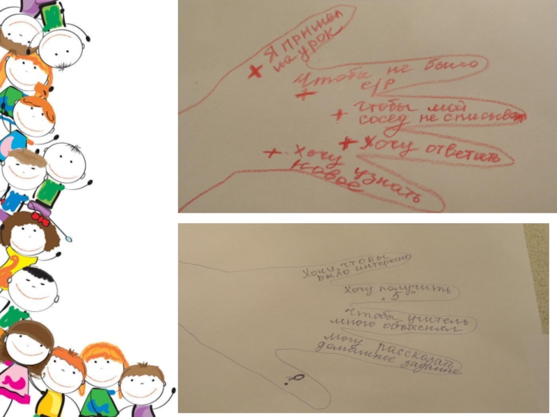 На листе, на каждом пальчике, нужно написать ответ на вопрос: «Чего я ожидаю от урока?» Ответы зачитываются вслух. Затем листы прикрепляются к ватману на доске до окончания урока.