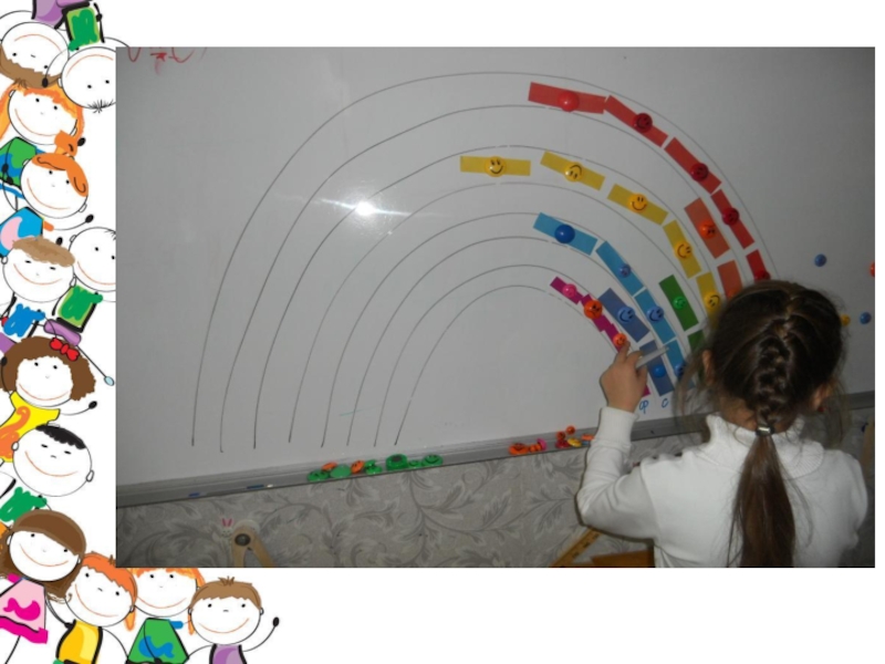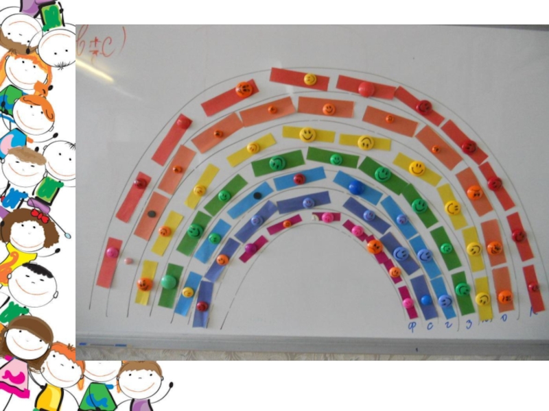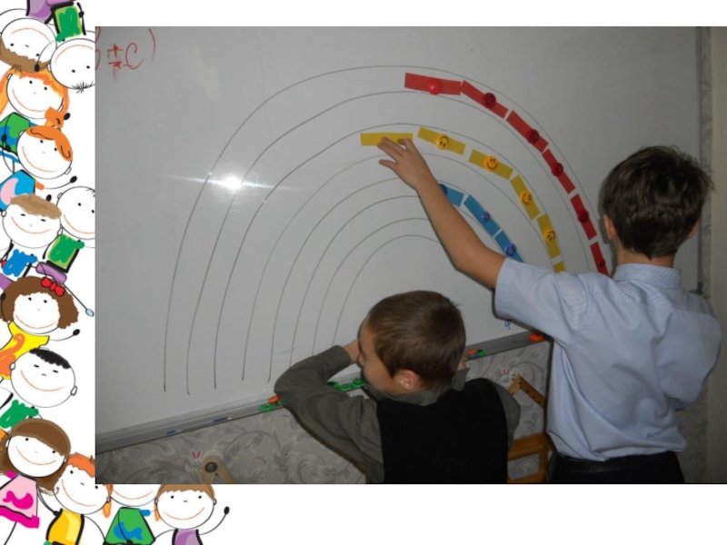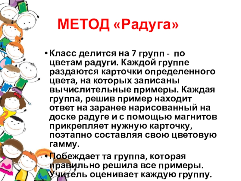 группе раздаются карточки определенного цвета, на которых записаны вычислительные примеры. Каждая группа, решив пример находит ответ на заранее нарисованный на доске радуге и с помощью магнитов прикрепляет нужную карточку, поэтапно составляя свою цветовую гамму.